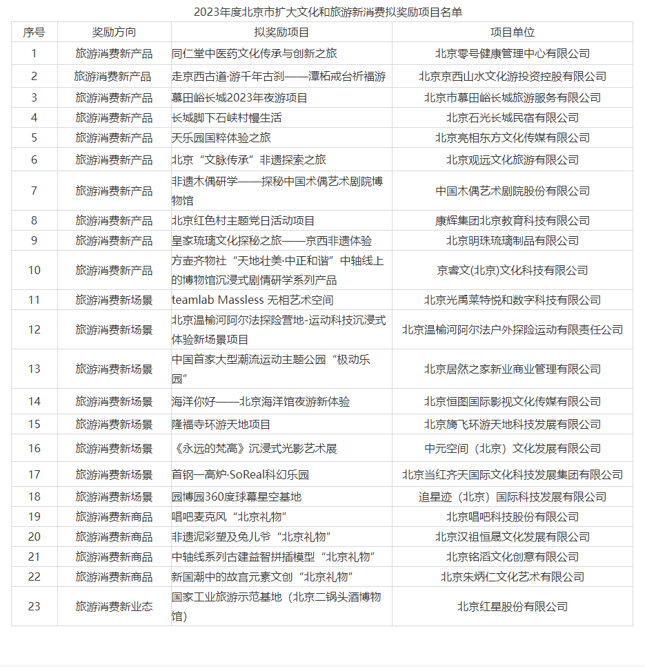 依据《北京市扩大文化和旅游新消费奖励办法》《关于公开征集2023年度北京市扩大文化和旅游新消费奖励项目的公告》等相关要求,2023年度北京市扩大文化和旅游新消费奖励项目评审工作已于日前结束。现将拟奖励项目予以公示,公示时间为2024年12月3日至12月10日。